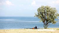 一位老人在伊塞克湖畔休息。