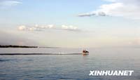 游客在伊塞克湖上乘摩托艇。