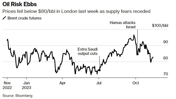 包含原油在内的广义上石油的供给增长大于需求增长步伐的预期,与国际原油价格回落基本吻合。上周,国际原油基准——布伦特原油价格一度跌至每桶80美元以下的三个月低点(当前在82美元附近),主要因人们对中东冲突将扰乱国际石油出口规模并加剧通胀压力的担忧情绪已经大幅减轻,而近期欧美以及部分亚洲国家制造业pmi数据疲软,暗示全球经济背景也变得愈发黯淡,刺激布伦特原油价格回落至80美元以下。